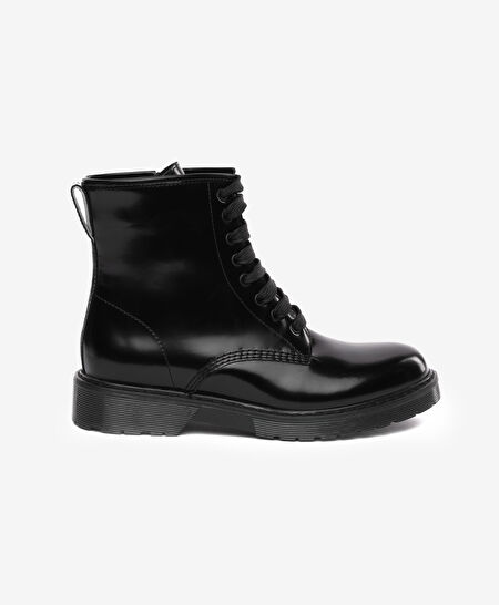 Kadın Parlak Siyah Hakiki Deri Memory Foam Taban Military Bot