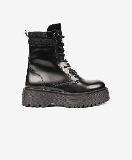 Kadın Parlak Siyah Hakiki Deri Memory Foam Taban Military Bot